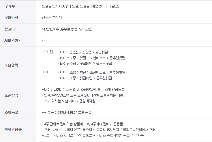 네이버앱(웹) 쇼핑탭 내 쇼핑핫딜 광고 전용 구좌에 3개의 소재가 랜덤하게 노출되며, 추가적으로 PC의 핫딜서비스 내 소셜몰추천핫딜에도 노출됩니다. 광고는 노출 2주전 쇼핑파트너센터에 접속하여 고정가선착순으로 구매할 수 있습니다. 1회 구매시 4주간 노출되며, 한 광고주당 최대 10개의 노출권을 구매할 수 있습니다. 노출권 1개당 2개의 노출구좌를 제공합니다.